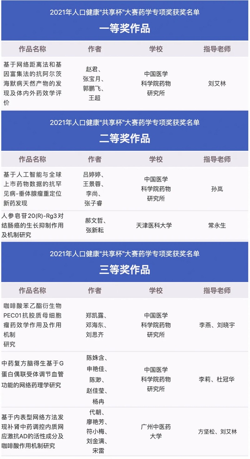 人口健康“共享杯”大赛是由国家人口健康科学数据中心主办的全国范围内的大学生专题竞赛,旨在推进国家科技平台资源进校园、进院所,进一步深化科技资源开放共享工作,促进在校大学生、研究生充分利用国家科技平台资源开展科技活动,培养学生科技创新实践能力。其中,药学专项奖旨在促进药学科技资源的利用,本次发布的2021年人口健康“共享杯”大赛药学专项奖包括一等奖1名、二等奖2名、三等奖3名。