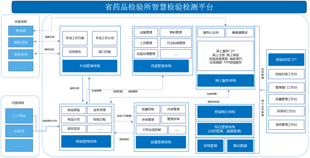 为贯彻落实国家药监局关于加快推进省级药品智慧监管的指导意见要求,全面强化药品安全检验能力,提升服务生物医药产业的精准度、覆盖面和时效性,广东省药品检验所精心研制并成功建设了智慧检验检测平台(以下简称检验平台),通过整合各类资源、优化流程,并深度融合互联网+、物联网、大数据、云计算及人工智能等前沿技术,打造一个全方位覆盖检验业务、全程质量控制、一体化管理的智慧实验室信息系统,以满足国家药监局关于构建监管“大系统、大平台、大数据”的总体部署。