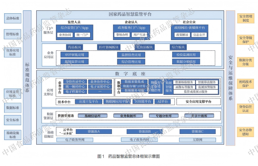 2022 年5 月,《药品监管网络安全与信息化建设“十四五”规划》(以下简称《规划》)发布,标志着药品监管数字化转型迈入了新的发展阶段[13]。《规划》系统总结了药品监管信息化建设的现状与需求,明确了“十四五”期间药品监管网络安全与信息化建设的指导思想、基本原则与总体目标,并提出了重点任务与四大保障措施。《规划》内容丰富、体系完整,可概括为“一个中心、四个基本点、四项原则、三大目标、五大能力、十六项任务”。其中,“一个中心”即以人民为中心的发展思想,充分体现了药品监管工作的根本宗旨与价值追求;“四个基本点”涵盖了落实“四个最严”要求,遵循“四化”(科学化、法治化、国际化、现代化)道路,践行四大治理理念(风险治理、责任治理、信用治理、全程治理),以及推进“四链”(生产链、产业链、责任链、监管链)融合等关键内容,为药品监管工作提供了全方位的行动指引与实践遵循;“四项原则”强调坚持系统思维与统筹协同、业务引领与数据驱动、技术赋能与融合创新、集约建设与安全可控,确保药品监管信息化建设的科学性、规范性与可持续性;“三大目标”聚焦于打造更完善的平台支撑、更智能的大数据驱动以及更全面的大系统应用,为药品监管工作提供强大的技术动力与保障;“五大能力”则涵盖了升级“两品一械”智慧监管能力、提升政务一体化服务能力、推进监管数据融合与驱动能力、筑牢药品智慧监管数字底座支撑能力以及夯实网络安全综合保障能力等多个维度,旨在全面提升药品监管的现代化水平与综合效能。通过规划的实施,药品监管数字化转型的方向更加明确,路径更加清晰,药品智慧监管总体框架不断完善(图1),为后续工作的深入推进奠定了坚实基础。