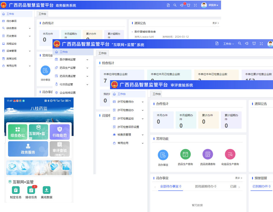 广西药品智慧监管平台2.0平台于2022年启动建设一期建设,主要在充分兼容和迁徙原有业务系统和数据的基础上,重新构建了统一的系统框架,采用微服务部署架构,实现各业务应用系统在一个统一的框架标准下开发,不仅能有效融合各个业务系统,而且提高了系统开发、部署、运维工作质量和效率。2023年,2.0平台二期进一步丰富和完善了监管数据的来源,完成了政务服务标准化和一体化改造,重新建设了新的执法办案、审评查验等业务系统,同年底与2.0平台互相对应的移动端“八桂药监APP”上线。随着各环节药品监管应用的逐步推开,2.0平台已实际成为广西省级药品智慧监管枢纽,有效支撑广西药品监管事业。